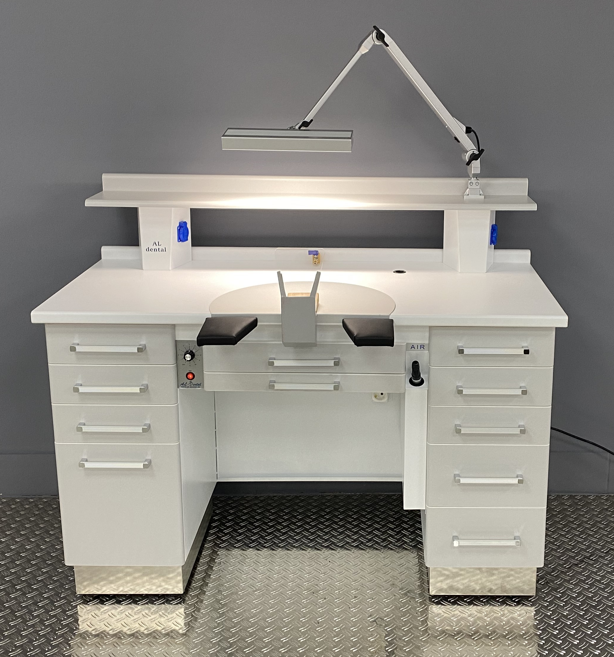 Al-Dental Einzelarbeitsplatz  Labortisch Dentalmöbel LED Gelenkleuchte Grau